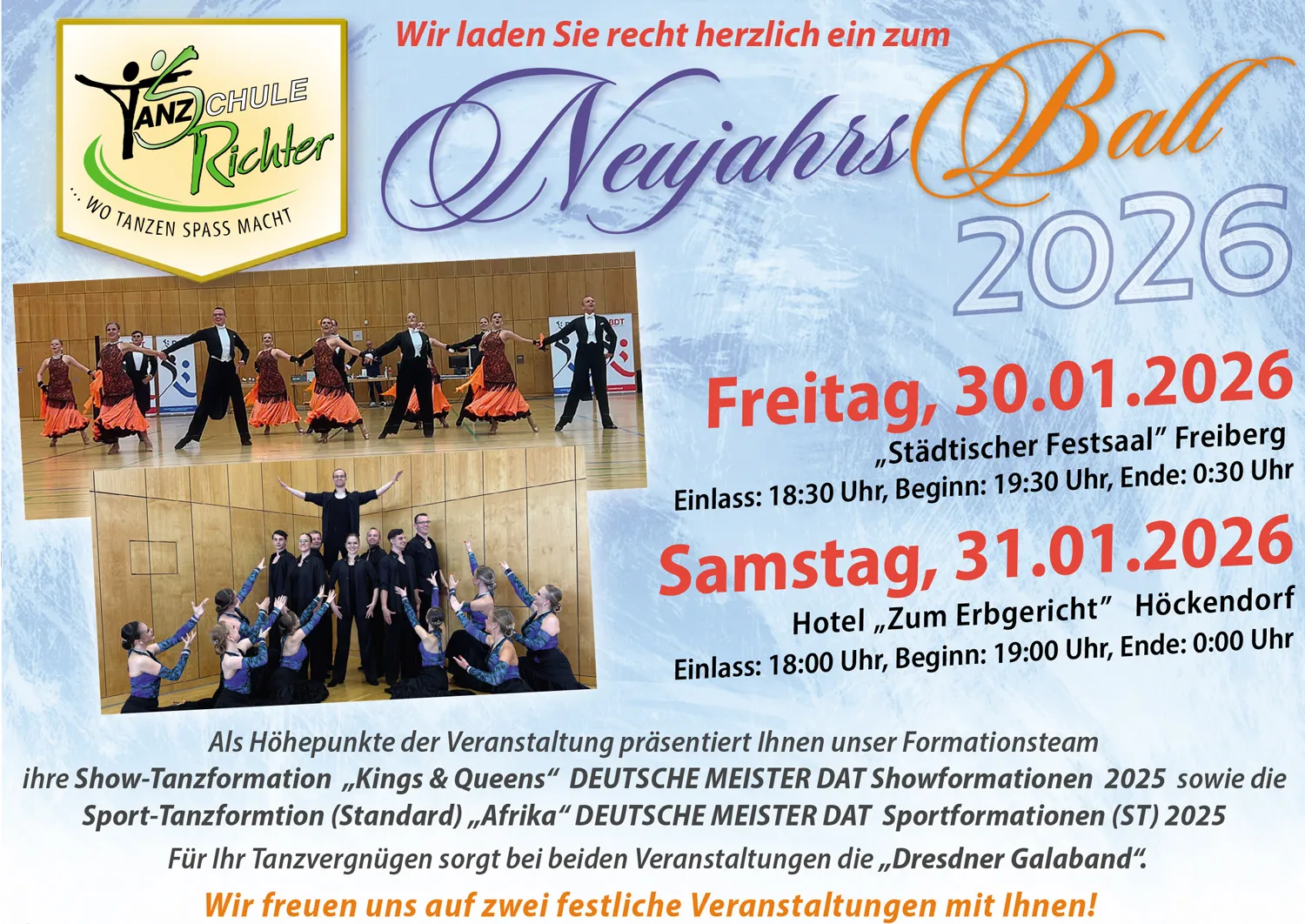 Hiermit laden wir Sie herzlich zu unseren Neujahrsbällen des Jahres 2026, in Freiberg & Höckendorf ein. Eine Anmeldung ist postalisch oder via